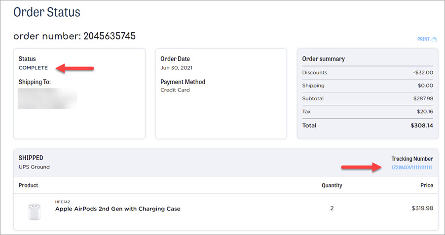 . You'll need the 10-digit order number and the billing ZIP code. You can find this information in your order confirmation email. After accessing your order, you’ll see the status and tracking information, if available yet.