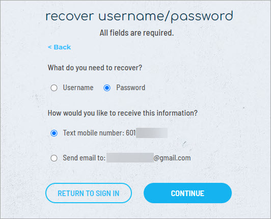 Indicate which you would like to recover—your username or password—and how you would like to receive the information—by text message or email.