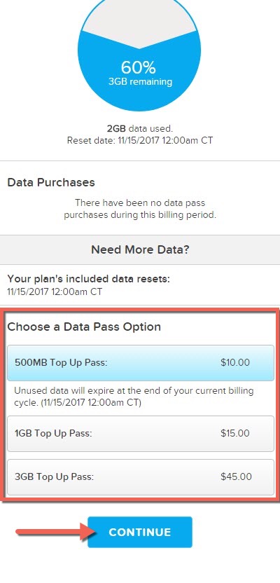 Remember, you can always use Wi-Fi for data access until your included data resets. But if you need to buy a Pass, follow the steps below: